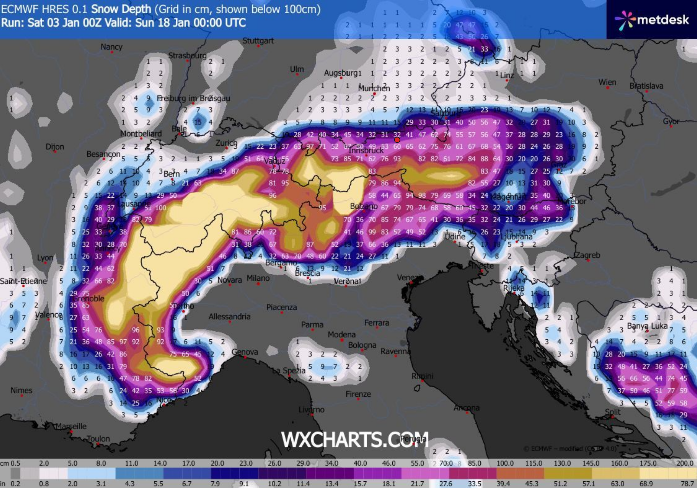 Die aktuellen Ensemble-Prognosen sowie die Schneehöhenkarten der großen Wettermodelle deuten darauf hin, dass der Winter im Laufe des Monats immer wieder präsent bleibt.